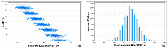 Example of Monte Carlo approach.: (a) Shear modulus distribution with depth; (b) Normal distribution of shear modulus.