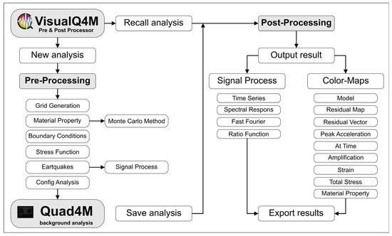 The difficulty in the construction of the conceptual numerical model led to the development of a robust pre- and post-processor capable of simplifying and speeding up the generation of the model and the interpretation of results. The VisualQ4M software includes a graphical user interface (GUI) with functionality and visual command able to generate, with excellent accuracy, geometric models suitable to Quad4M program. Figure 2 shows the flowchart of the VisualQ4M. It is worth noting the set of possibilities, such as the Monte Carlo Method, that were included in this version. The option is valid for Unit Weight, Poisson ratio, shear modulus, and damping ratio, where it is possible to define the variation range for each material according to statistical distributions.