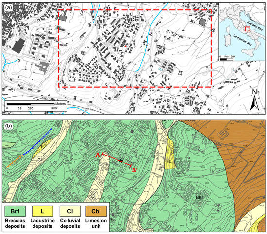 Test case location in city of L’Aquila (a). Geological map of the urban area of the L’Aquila city -First level-Macroarea 1 (b). The red line is the Section A-A’ used in analyses.