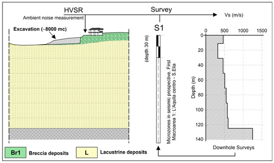 The site is part of the central Apennine Mountains in a heavily tectonized area (Figure 3). There are soils belonging to the Meso-Cenozoic succession, mainly represented by calcarenite, marly limestone, and bioclastic calcirudite. In the area, these deposits are mostly covered by fluvial deposits, mainly sandy gravel, sandy pelitic lake deposits, and, sometimes, by debris flow and colluvial debris layers. The covering deposits are granular clastic sediments (lake silts, alluvial deposits, debris flow, and pluvio-colluvial deposits). The definition of the geometrical structure and the properties of the layer was carried out by survey report and from the official Geological Map. The local stratigraphy (Figure 4) is composed of an upper seismic layer (carryover terrains and calcareous breccias) and a lower seismic layer of clayey silt materials.
