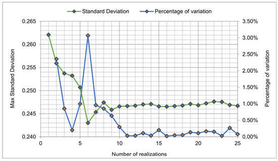 The Monte Carlo method provides a set of numerical results that belong to a certain statistic; the more simulations are carried out, the better the statistics are determined. Therefore, in order to verify the acceptability of the approach and to identify a sufficient number of simulations to be carried out, we selected, as a parameter, the variation of the standard deviation of the ensemble emerging from the application of the method versus the number of repeated simulations. Then, we introduced the “Percentage of Variation” of the standard deviation resulting from n simulations, , compared to the standard deviation resulting from n − 1 simulations, :