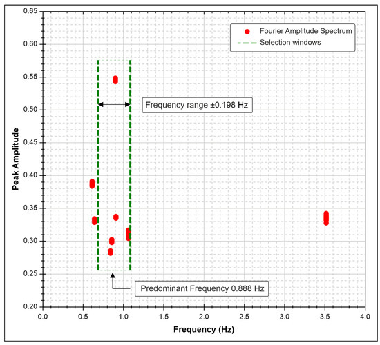 Subsequently, each individual frequency spectrum was compared with this natural frequency. It is evident that some numerical results do not seem to be congruent with the actual site conditions. To simplify the comparison, a dispersion plot of the pair “Frequency-Peak Amplitude” values of all calculated Fourier spectra were constructed. To exclude non-congruent data, a band-pass filter (BPF) was applied with a central frequency equal to the site frequency of 0.888 Hz and a deviation equal to ±0.198 Hz. Figure 11 shows the pairs of inappropriate and appropriate values and the range considered as a reference for the current study. Figure 12 shows, for the current topographic profile, the final average spectrum calculate with a probabilistic approach and with a band-pass filter (BPF) with respect to the natural frequency of the site.