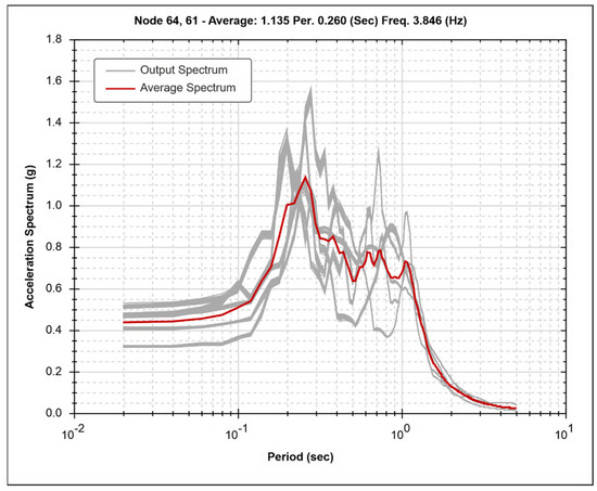 Figure 7 shows the numerical results (seven gray curves), virtually measured in the red dot indicated in Figure 6, following the application of the seven accelerograms required by the Italian National Regulations (as detailed below). Figure 8 also shows, colored in red, the average value of the seven simulations.