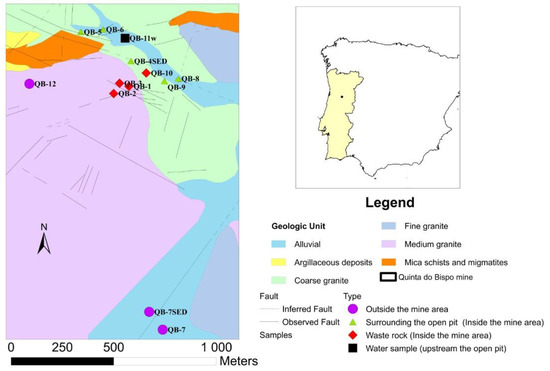 Geological context of the Quinta do Bispo (Portugal) old uranium mine area, with the sampling point locations (QB) (adapted from [26]).