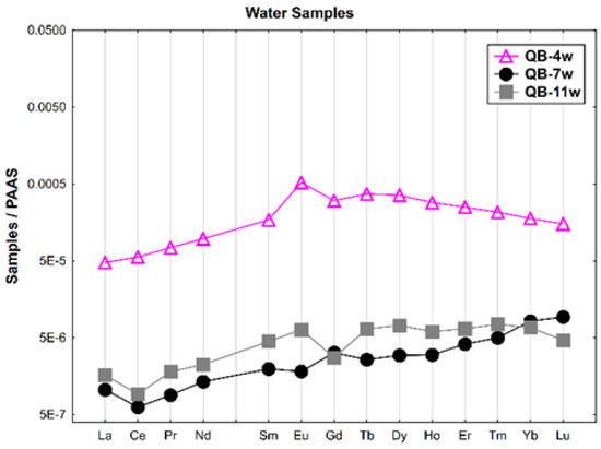 The REE patterns of the water samples (dissolved concentration) normalized according to Post-Archean Australian Shale (PAAS) [36] are shown in Figure 2. A general enrichment of the HREE relative to the LREE is observed. The water from the open pit (QB-4w) presents the highest REE contents and a positive Eu anomaly. The groundwater collected upstream of the open pit (QB-11w) shows negative Ce and Gd anomalies. In general, the water collected in the Castelo river (QB-7w), outside the mine area, has the lowest REE contents, a negative Ce anomaly and a slight Gd positive anomaly.