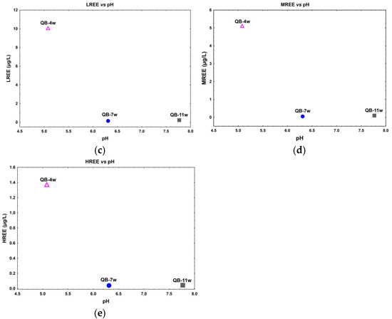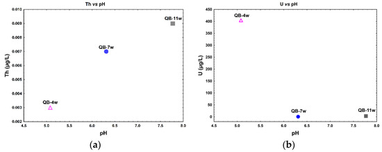 A direct relation between Th dissolved concentration with the pH is observed (Figure 3a), while an inverse relation between U relative to pH seems to occur in the water samples (Figure 3b). In fact, for lower pH values (≈5), observed in sample QB-4w, higher U, ∑LREE, ∑MREE, and ∑HREE dissolved concentrations were observed. The samples with pH values 6–8 have a lower and more stable dissolved concentration of these elements (Figure 3b–e).