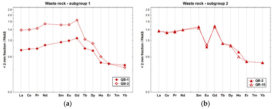 REE patterns of the whole samples of soils collected inside the mine area, on the waste rock piles from the Quinta do Bispo old uranium mine (Viseu, Portugal) relative to PAAS [36]: (a) subgroup 1 (QB-1 and QB-3); and (b) subgroup 2 (QB-2 and QB-10).