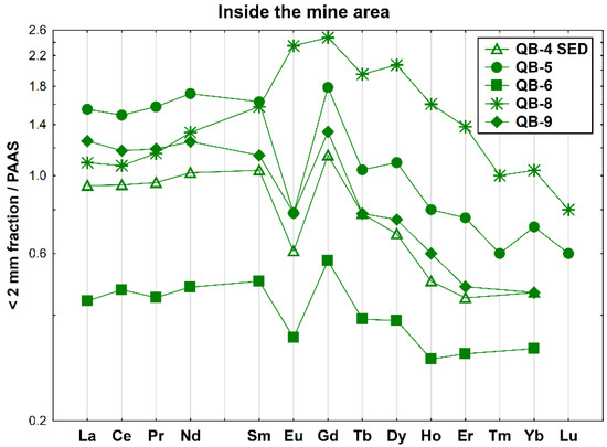 Concerning the soil samples, a general enrichment of REE is observed when the values were normalized to PAAS, which might be explained by the weathering conditions that lead to a higher REE mobilization and incorporation in newly formed crystalline or amorphous phases. However, QB-1 (the sample collected in the waste rock pile) and QB-6 (the soil sample collected surrounding the mine area) are depleted in REE relative to the PAAS concentration, which can be due to the REE retention in primary minerals, which is resistant to the weathering processes, as reported is previous studies [47,48,49].