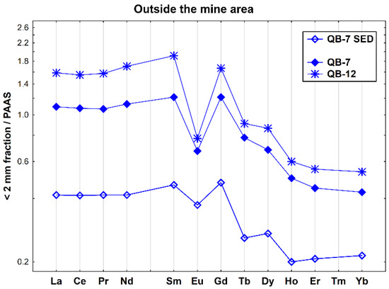 The soil samples collected outside the mine area (QB-7 and QB-12) exhibit similar pH values, but the lanthanide and actinide concentrations vary significantly. Additionally, the sediment sample taken outside the mine area has lower pH values and lower chemical concentrations in comparison with the other sediment sample (see Figure 7a–e).