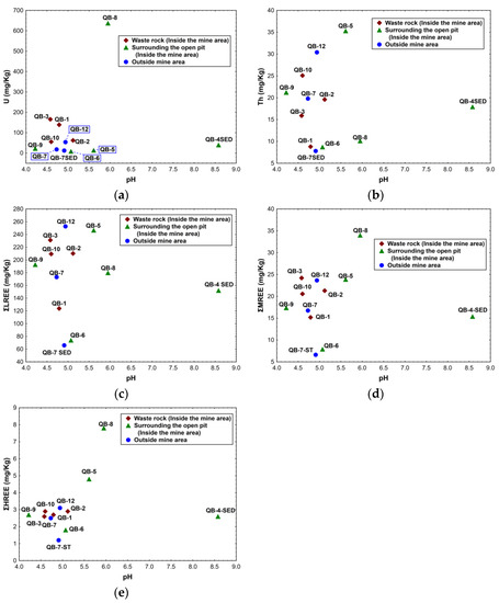 In the soil samples collected in the area surrounding the open pit, no relationship between the chemical results and pH values was found (see Figure 7). Nevertheless, sample QB-8 has a higher U, ΣMREE, and ΣHREE concentration and a higher pH value.