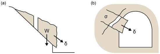Figure 3. (a) Sliding block along a slope (represented in laboratory tests by CNL/CNL* boundary conditions); (b) sliding block in an underground excavation (represented in laboratory tests by CNS boundary conditions) (modified after [20]).