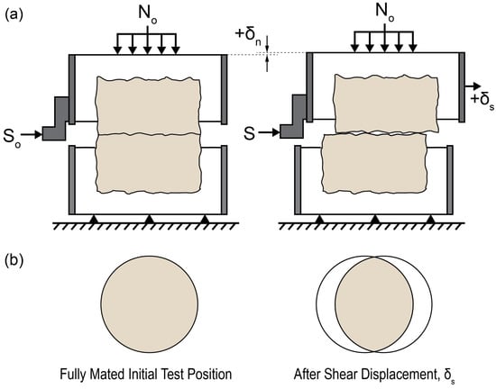 Direct shear testing is a common laboratory method used to measure geomechanical properties of rock discontinuities [1,2], including normal and shear stiffness (e.g., [3]), peak and residual shear strengths (e.g., [4]), and dilation angles (e.g., [5,6,7]). Measured shear strengths can be used to determine constitutive model parameters of linear and/or nonlinear failure envelopes. Linear methods commonly characterize discontinuities in terms of Mohr–Coulomb constitutive parameters: joint friction angle (φ) and joint shear strength y-intercept in shear stress versus normal stress space (apparent cohesion, c). Nonlinear approaches commonly use the Barton–Bandis constitutive model, which quantifies discontinuity shear strength in terms of joint roughness coefficient (JRC), joint compressive strength (JCS), and residual friction angle (φr) [4,8]. The accuracy of these calculated geomechanical properties partly depends on the selected laboratory test procedures used to measure the data in direct shear. Staged tests (e.g., single stage or multi-stage) and boundary conditions (e.g., constant normal load, constant normal stress, or constant normal stiffness) are the laboratory procedures that are the focus of this paper.