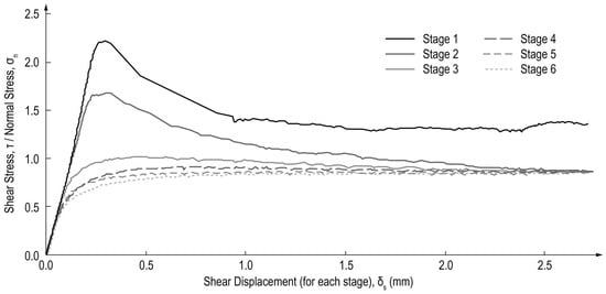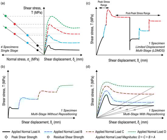The sustained shear stress in the post-peak region is referred to as the residual or ultimate shear strength. To define a shear strength envelope, ISRM and ASTM require three to five shear strengths measured at different normal loads. To achieve this, three methods have been developed: single-stage, multi-stage, and limited displacement multi-stage direct shear testing. Currently, only the first two methods are described in detail by the ISRM Suggested Methods [1,2] and ASTM Standard [9]. Limited displacement multi-stage direct shear testing is a more recent development and is described by several authors [10,11,12]. The details of each staging methodology are further discussed in Section 5.
