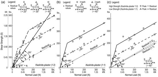 Figure 7. Shear strength envelopes for specimens with (a) varying asperity teeth inclinations; (b) varying number of asperity teeth; and (c) varying material strengths (modified after [53]).