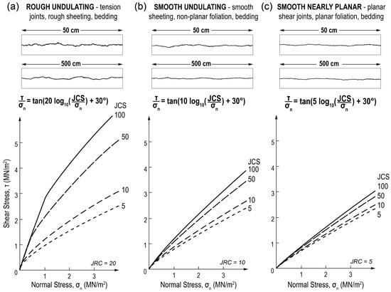 This nonlinear constitutive model is an empirical relationship for shear strength of rock fractures (i.e., joints) that was originally developed to be used in three different ways: (i) curve fitting to experimental peak shear strength data; (ii) extrapolation of experimental peak shear strength data; and (iii) prediction of peak shear strength data [4]. Over time, the equation has been revisited by the author and the up-to-date equation is expressed by Equation (6) [8]. Equation (6) contains three main parameters that vary shear strength ( τ , MPa) with respect to the applied effective normal stress ( σ n , MPa), depending on the joint character: joint roughness coefficient ( J R C , unitless), joint wall compressive strength ( J C S , MPa), and the residual friction angle ( ϕ r , °) [4,59]. Figure 9 contains three peak shear strength envelopes that were calculated using Equation (6) to illustrate the nature of the empirical law, and the effects that both J R C and J C S have on peak shear strength [4].