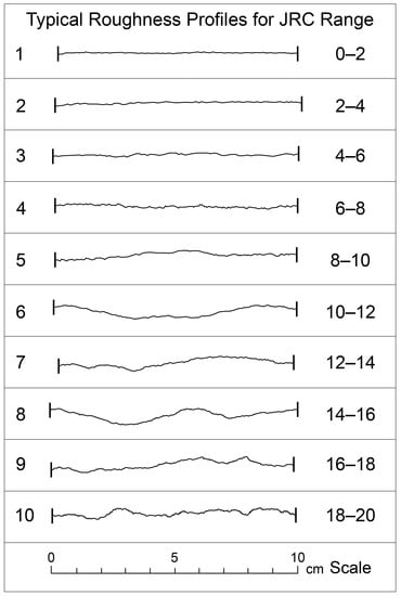 In the event that shear stress data are unavailable, Barton and Choubey [4] presented an alternative method to crudely estimate the JRC of a joint. This method involves visually comparing the roughness profile for the joint in question to a series of typical roughness profiles. The 10 typical roughness profiles were based on 136 tested joint specimens and are illustrated here in Figure 10. Although this method is still commonly used today, it was originally stated that the most satisfactory method to obtain JRC is by back-calculation, based on a tilt and/or push/pull test. In this instance, the angle at which sliding occurs represents ( tan 1 τ / σ n ) in Equation (7) and the shear stress and normal stress are generated by the weight of the top half of the specimen [4]. It is acknowledged and emphasized by Barton and Oslo [60] that the “ten JRC profiles” were only developed to illustrate the range of surfaces tested and that using them to represent a surface’s roughness is far too subjective a method.