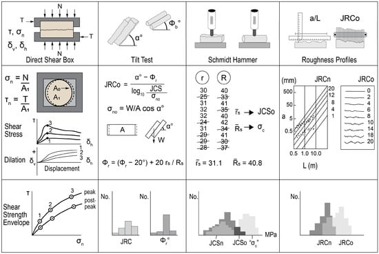 Figure 12. Summary of the recommended direct shear and index testing for using the Barton–Bandis joint shear strength criterion; column 1 (far left): direct shear test principles (shear load, T, should be applied parallel to the discontinuous surface to avoid creating moment); column 2: tilt test principles; column 3: Schmidt hammer principles; column 4 (far right): roughness recording principles (modified after [60,62]).
