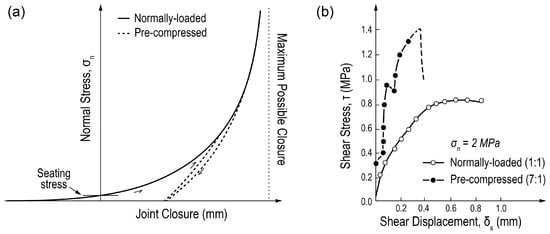 Figure 14. Normally loaded and precompressed deformation behaviour of (a) joints subject to normal stress (modified after [20,31]); and (b) two weathered sandstone joints, with reported overclosure ratios, subject to shear stress (modified after [73]).
