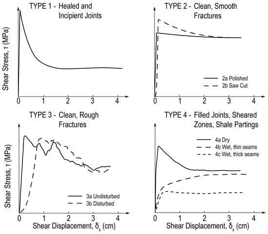 Figure 15. Typical shear stress–deformation relationships for four types of discontinuities (modified after [75]).