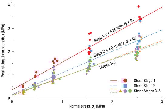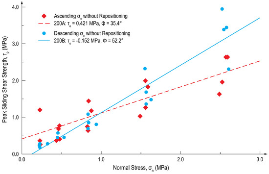 Figure 24. Peak shear strengths for a multi-stage direct shear test without repositioning following ascending (target stresses 0.2–0.4–0.8–1.5–2.5 MPa) and descending (target stresses 2.5–1.5–0.8–0.4–0.2 MPa) orders of applied normal stresses (modified after [17]).