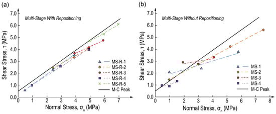 Figure 22. Shear stress vs. normal stress with linear best-fit Mohr–Coulomb failure envelopes of (a) five three-staged multi-stage direct shear tests with repositioning and (b) four three-staged multi-stage direct shear tests without repositioning (modified after [18]).