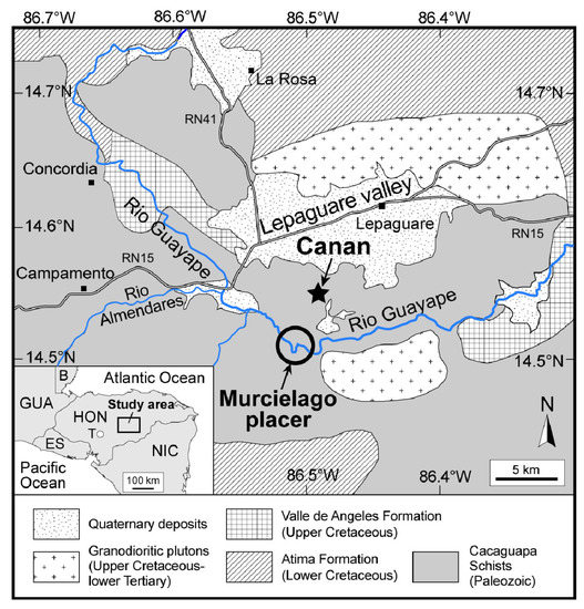 Geological sketch map of the investigated area of the Lepaguare Valley (Olancho Department) with the location of the Murcielago gold placer and the Canan lode deposit. Main geological units and fluvial system (in blue) are reported. RN = route number. Inset: GUA, Guatemala; B, Belize; HON, Honduras; ES, El Salvador; NIC, Nicaragua; T, Tegucigalpa city. Modified from [13].