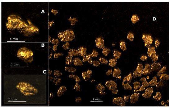 Gold with most common morphology of the Murcielago fluvial placer: (A–C) rounded-spherical type; (D) flattened-type grains.