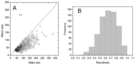 Analysis of the morphology of the Murcielago nuggets: (A) Major vs. minor axes (in pixel units) of the ellipse that approximates the nugget morphology (1:1 line representing circular shape is reported); (B) frequency distribution of the calculated roundness (see text for explanation).