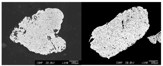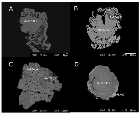 The morphology of the polished gold grain sections revealed, together with the irregular, sub-circular, and elliptical shapes observed in the optical photos, the presence of porous structures and, rarely, Au-rich rims (Figure 4).