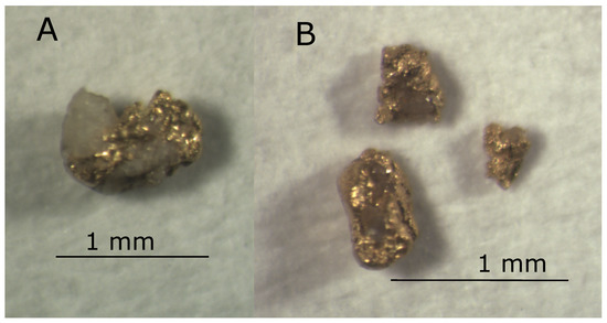 (A,B) Gold grains associated with quartz from the Murcielago placer.
