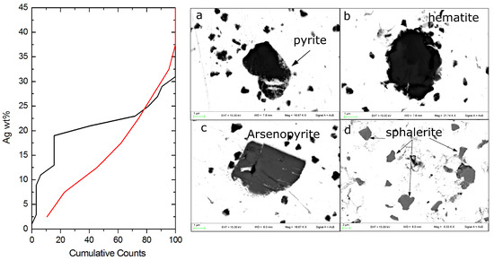 Cumulative counts vs Ag content (wt%) of the Murcielago gold (red line) and the Canan lode gold (black line). (a–d) SEM images of ore-mineral inclusions in Murcielago gold grains. (a) pyrite; (b) hematite; (c) arsenopyrite; (d) sphalerite.