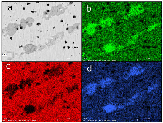 SEM-EDS measurements are compatible (despite being altered) with pyrite, arsenopyrite, sphalerite, and hematite (Figure 6). Trails of acanthite crystals (AgS) can be observed in the map of Figure 7. Grain1 of composition AuAg hosts inclusions of arsenopyrite, whereas grain2 of composition AuAg hosts an association of pyrite, acanthite, sphalerite, and hematite as inclusions (Table A6).