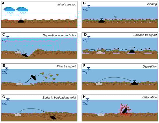 Once the mine is mobilized, the transport process could activate and trigger the ordnance (Figure 3, panel H). Although this has not been reported, it would neutralize the potential threat. In the other scenario, the ordnance reaches an area of lower flow velocities and shear stresses, so that it is deposited on the riverbed or bank and continues to be active. The ordnance could then be buried by bedload material or suspended sediment.