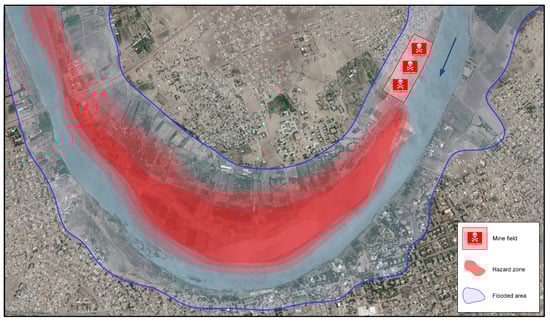 Floods are natural phenomena that usually affect areas close to the actual stream or waterway. However, the flow velocities on the floodplain can also cause the soil to be floated, then mobilized, and finally eroded. Objects in the soil, such as large stones, roots, and even landmines or explosive remnants of war can be unearthed and carried away. Deposition occurs in areas of becalmed flow or after the end of high water. The mine will then migrate to previously uncontaminated areas as reported by [20,21,22]. As a result, existing mine maps are no longer accurate. In addition, when urban areas are flooded, stockpiles of weapons and ammunition may be washed away, as for example reported for the Samac flood in 2014 [23].