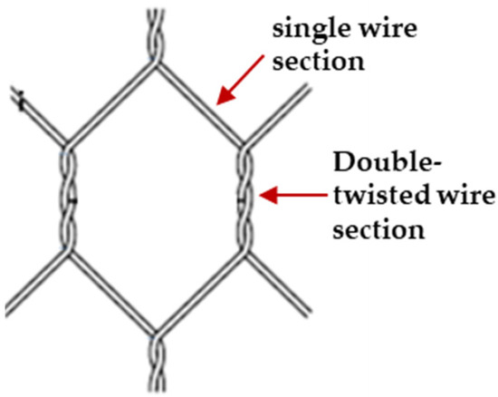 First, in the studies cited above, the modelling of double-twisted wire mesh has been simplified to reduce the difficulties and computing time of geometrical modelling. Double-twisted wire mesh consists of symmetrically woven hexagonal cells, wherein each cell has four sections (sides) of single wires and two sections of twisted wires, as shown in Figure 3. The structure of the cells affects the macroscopic strength and flexibility of the whole mesh. When a wire mesh is subjected to an impact, the wires in the double-twisted sections stretch and twist simultaneously. The impact energy is dissipated through friction between the double-twisted wires and through elastoplastic stretching of individual wires. If the impact load exceeds the material strength, single-wire sections become damaged, which causes the unravelling of the adjacent wires, which itself degrades the response of nearby cells. This zone of degradation increases with increasing impact load. These interactions cannot be simulated accurately if the finite element (FE) model of the double-twisted section is represented using a single-beam element [8,15]. A similar issue occurs when representing the terminal ends of the twisted sections with discontinuous nodes, when employing the discrete element approach [9,10,13,14,16].