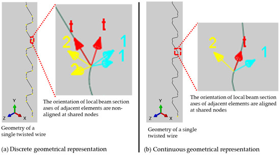 As each wire consists of straight and twisted sections, its geometry can be created from connected straight and twisted segments to form a 3D sketch path. This simplified approach creates a discrete geometrical representation of the wires, as shown in Figure 4a. This leads to convergence difficulties and inaccuracies in the calculation of the directional components when the finite element model is created. This is because the normal sections and cross-sections of neighbouring wire elements are not collinear at the connection points. Consequently, wires are created as a single continuous geometry with no interconnection points, which represents the wire mesh length, as shown in Figure 4b.