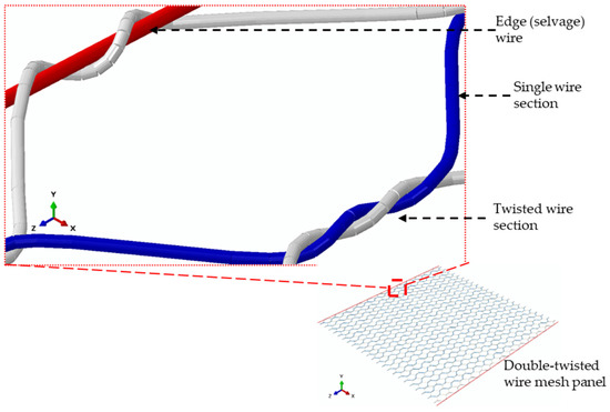 A typical model of a hexagonal double-twisted wire mesh panel with an optimal element size and element distribution is shown in Figure 5. The edge wire (selvedge wire) is also presented, and has a larger diameter than the mesh itself.