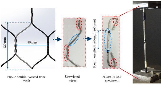 To determine the necessary parameters for the elastoplastic constitutive and material failure model, a series of uniaxial tensile tests were carried out on single wires using a uniaxial testing machine (Instron 3369) and a video-extensometer (LIMESS RTSS) for optical strain measurements. The preparation of the test specimens and the test setup are shown in Figure 6. The effective length of the specimens was similar to the single wire sections in the mesh cells. The test specimens were taken from a mesh panel and straightened carefully, in order to avoid twisting the 60 mm test section (highlighted in blue). The bent sections were gripped by the tensile test machine, which increases the contact area between the wires and the grips to prevent wire slippage and material failure occurrence near the grips.