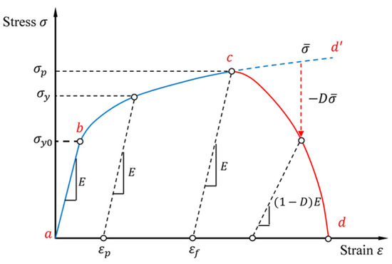 The material damage initiation criterion and the damage evolution law describe the progressive degradation in material stiffness up to the point of material failure, as illustrated by the typical uniaxial stress–strain response shown in Figure 7. The following elements are required to define this model in Abaqus: