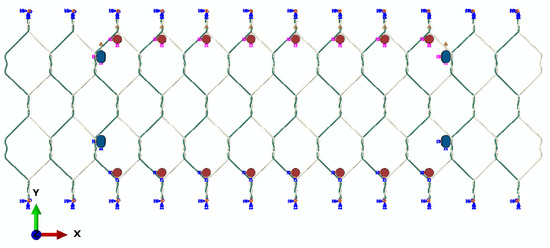The model’s predictions have been compared with the published experimental data [9,15] obtained from static in-plane tensile load tests on mesh panels of dimensions 320 × 580 mm, with 80 × 100 mm hexagonal double-twisted cells and a 2.7 mm wire diameter. In these tests, the wire mesh panel was subjected to a uniform tensile load along the top edge at a constant loading rate of 10 mm/min. The lower edge of the panel was fully restrained, and an additional four points (near the vertical sides) were restrained from horizontal movement. In the model, additional constraints were imposed at the ends of wires to prevent them from unravelling, as shown in Figure 8.