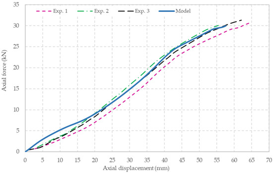 The experimental data and the model’s predictions of vertical reaction force to the vertical displacement at the top of the spherical plate are plotted in Figure 11. The results show that the model satisfactorily predicts the load–deformation response of the panel.