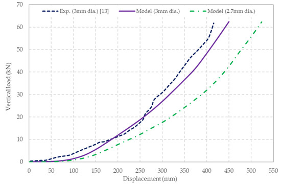 For comparison purposes, the model’s predictions for a 2.7 mm diameter wire mesh is also shown in Figure 11. As expected, this mesh responds more flexibly to the load.