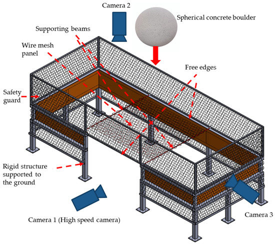 Various panel lengths and boulder masses were employed. The test rig has two adjustable horizontal crossbeams which support the panel, and a high-speed camera (500 fps) is used to capture the boulder velocity and the wire mesh deformation. Two additional cameras are used to record the lateral deformation of the panel and the deflection of the supporting beams.