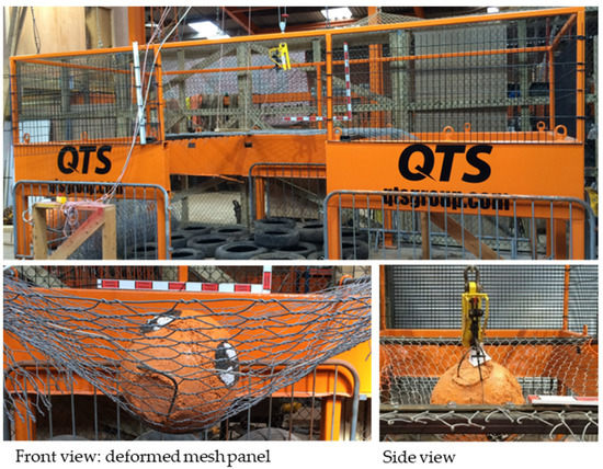 In general, impact tests are conducted by dropping masses onto wire meshes that are fully constrained on all four sides [5,8,9,10]. This test arrangement over-constrains the wire mesh and cannot reproduce the response of wire meshes in the field, where they are strongly constrained by the posts but only partially restrained longitudinally by wire ropes (Figure 2). To overcome this limitation, in this study, an impact testing rig was designed and used to laterally test the constrained wire mesh panels under more realistic conditions, as shown in Figure 12 and Figure 13.