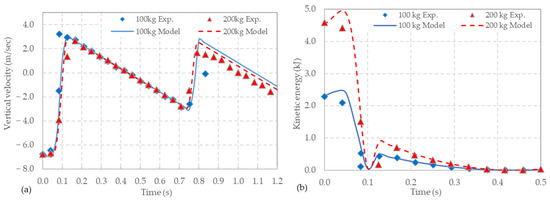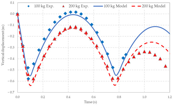 Figure 14 shows a comparison between measured and simulated displacements for these two tests. The model effectively reproduces the vertical response of the masses during the first impact and beyond. The accuracy of the model is reinforced by the observation that the rebound, and even the subsequent impact, are also well captured by the algorithm.