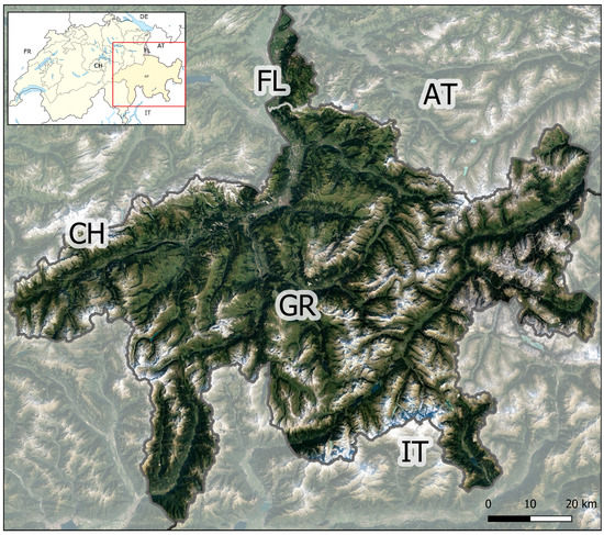 The study area covers the country of Liechtenstein (FL, officially the Principality of Liechtenstein) which has an area of 158 km2 and the Swiss canton of Grisons (GR), which has a total area of 7105 km2. Liechtenstein is situated in the Upper Rhine valley of the European Alps and is bordered to the east by the Austrian state of Vorarlberg, to the south by GR (see Figure 1). The Rhine river forms the entire western border of Liechtenstein. The highest point of Liechtenstein is the Grauspitz which has an altitude of 2599 m above sea level (a.s.l.). Liechtenstein lies entirely in the Rätikon, a mountain range that forms the geological border between the Eastern and Western Alps. The Rätikon mainly consist of sedimentary rocks (for a large part limestone), where the northern part is assigned to the Northern Limestone Alps, while the Southern part belongs to the Bündner Schist Nappe of the Western Alps, which runs towards the south-west into GR. The highest point of GR is the Piz Bernina (4049 m a.s.l.), which consists of Diorite and is part of a sub-Austroalpine nappe consisting of cristalline rocks. Further important tectonic zones and nappes in GR include the Aar- and Gotthardmassif, which consists of material from the original European tectonic plate (gneisses, schists, and amphibolites), and penninic nappes, which contain a wide range of rock varieties, such as sandstones, dolomites, as well as high grade metamorphic rocks, such as gneisses and slates. Both in GR and FL, Flysch type deposits are found. The presented details on the geology originate from [32,33]. The majority of the study area can be defined as steep mountainous terrain in which the protection of residential areas and infrastructure against rockfall and other natural hazards, not only for the local inhabitants but also for the many tourists that visit the area, is a challenging task [22]. The population in GR amounts to 202,509 (in 2022, i.e., 28.5 inhabitants km−2), in FL this amounts to 39,379 (in 2022, i.e., 249 inhabitants km−2).
