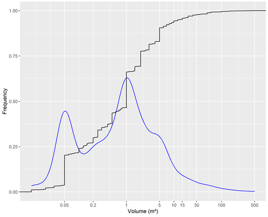 Cumulative frequency (in black) and density (in blue) of the block volumes of the 1577 registered PE in the study area.