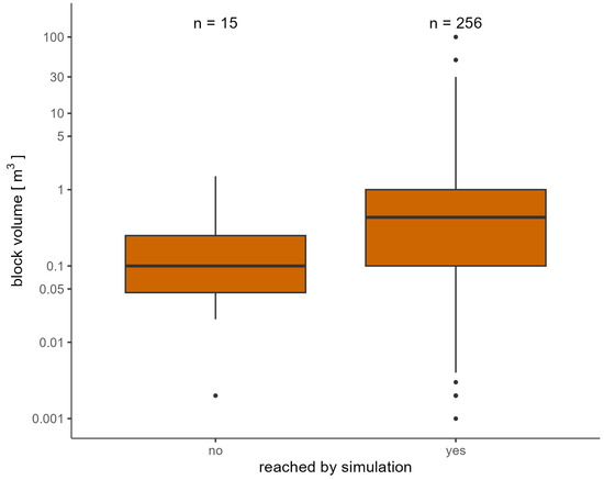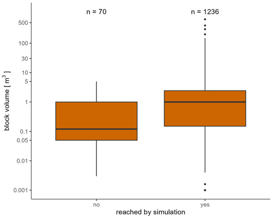 The analysis of the PE in FL showed that, 256 of the total of 271 events were reached by the simulation, meaning that 94.5% could be reproduced (see Figure 4). The median of the block volume of the PE that could not be reproduced by the simulations was 0.1 m3. For GR, 1236 of the 1306 PE were reached by the simulated trajectories, which results in a reproduction of 94.6% (see Figure 5) of the PE. Here, the median of the block volume of the PE that could not be reproduced by the simulations was 0.12 m3.