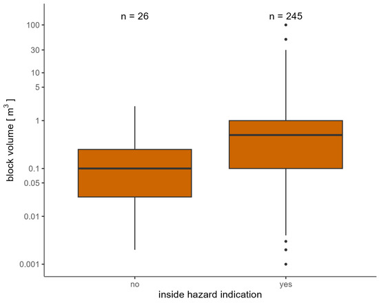 For FL, the proportion of that lie within the automatically delimited HIZ using a threshold of 1.5% is 90.4% (Figure 6). For GR, a threshold of 1.3% was used. Here, the proportion of that lie within the automatically delimited HIZ is 82.2% (Figure 7). The analysis on the distribution of the values in relation to block volume classes showed no clear trend (see Figure 8). The median of the is highest for the block volume class > 0.2 and m3 with a value of 4.1% and lowest for the block volume class m3 with a value of 2.3%. The median values differ only slightly between the block volume classes. The analysis shows that the range of values between the 25th and 75th percentile tends to decrease with increasing block volume.