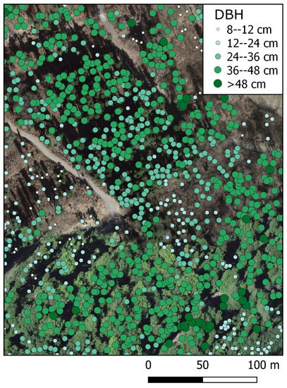 In order to represent the forest cover as detailed as possible, the detection results from [55] were used as a basis for the forest data. In addition to the detected trees, additional trees were generated for the representation of the non-detected trees in the middle and lower understory layers in the forests on the basis of the estimates of a statistical model. The statistical comparison between detected and additionally generated trees on the one hand and the inventory data on the other hand showed that the number of stems and the basal area were generally underestimated. At the same time, visual comparisons between orthophoto and the detected and additionally generated trees implied that the forest structure is well represented (see, e.g., Figure 9). The spatial distribution of tree heights and, related to this, also the mean DBH values, as well as the main horizontal structure of the forest (gaps and tree positions) were well represented with the used single tree data. Nevertheless, as expected, slight difference between real and reconstructed forest structures exist. An important aspect which lead to a pessimistic representation of the protective effect of the forest is due to the use of a linear regression between tree height and DBH per tree type. As a result, the variation in DBH found in reality is not represented and mainly trees with a large DBH are represented with a smaller DBH in the digital data. This leads to an underestimation of the energy dissipative capacity of the trees with wide stems.